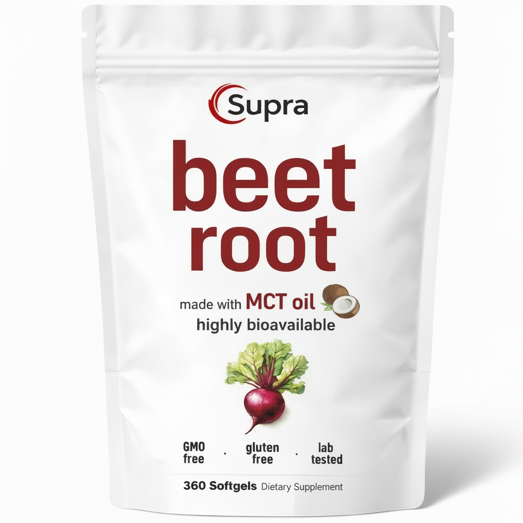 Supra Beet Root Softgels deliver a powerful 9,000mg beet root equivalent in a highly absorbable softgel made with MCT oil from coconut. This refined formula supports healthy circulation, natural nitric oxide production, and sustained daily energy—without powders, stimulants, or harsh additives.
