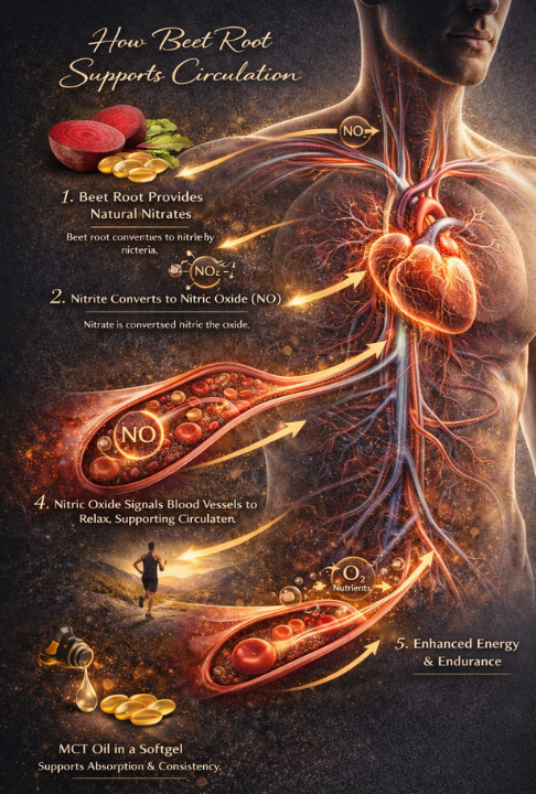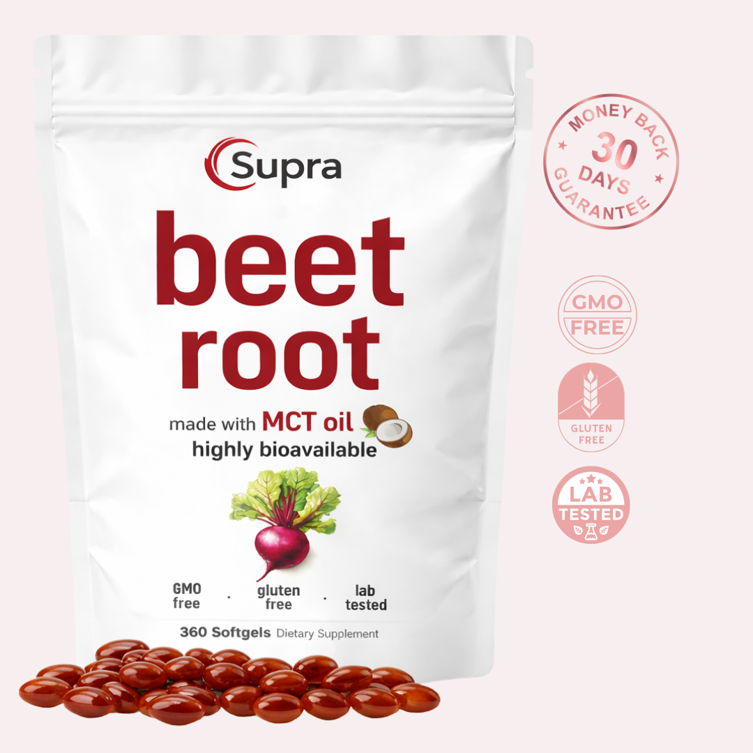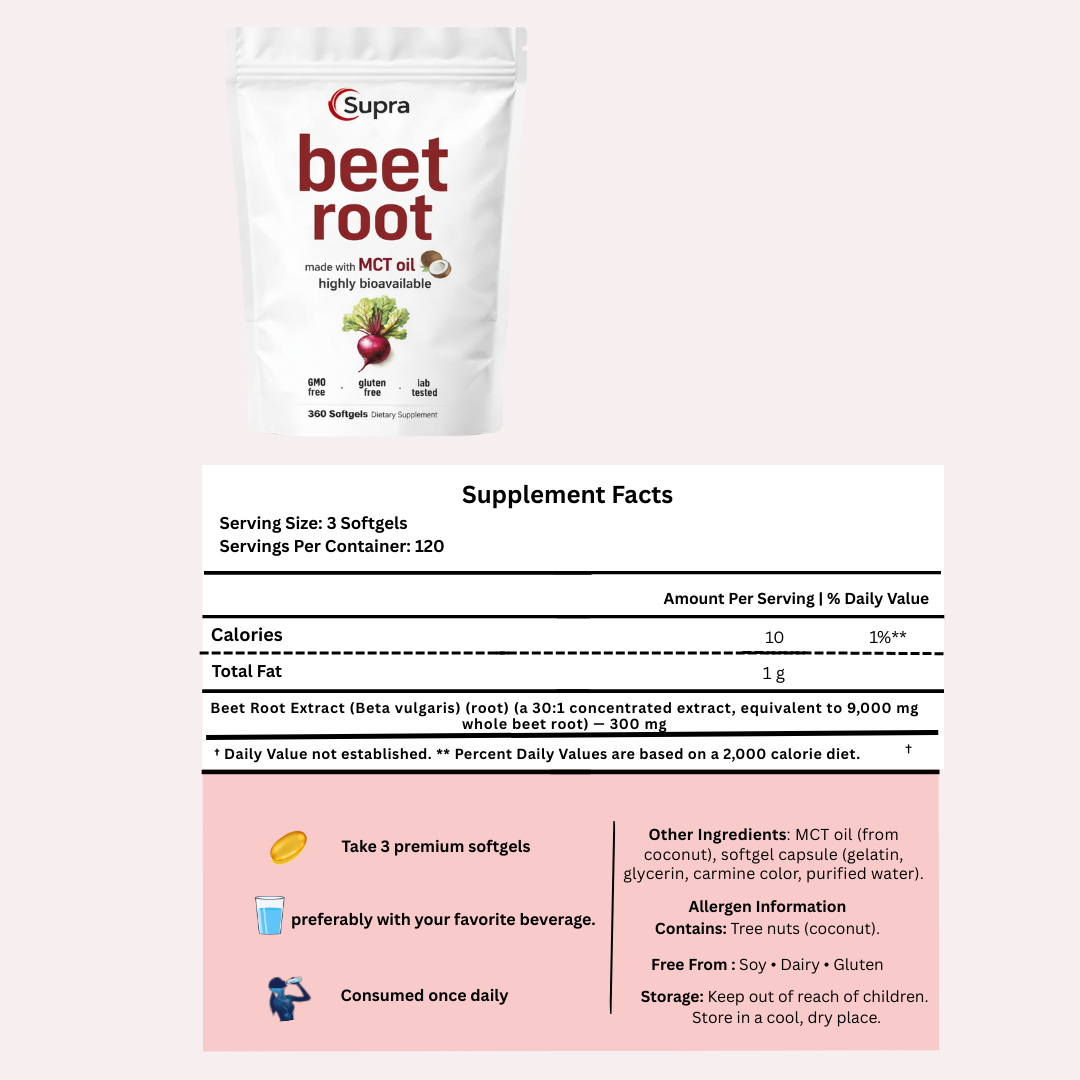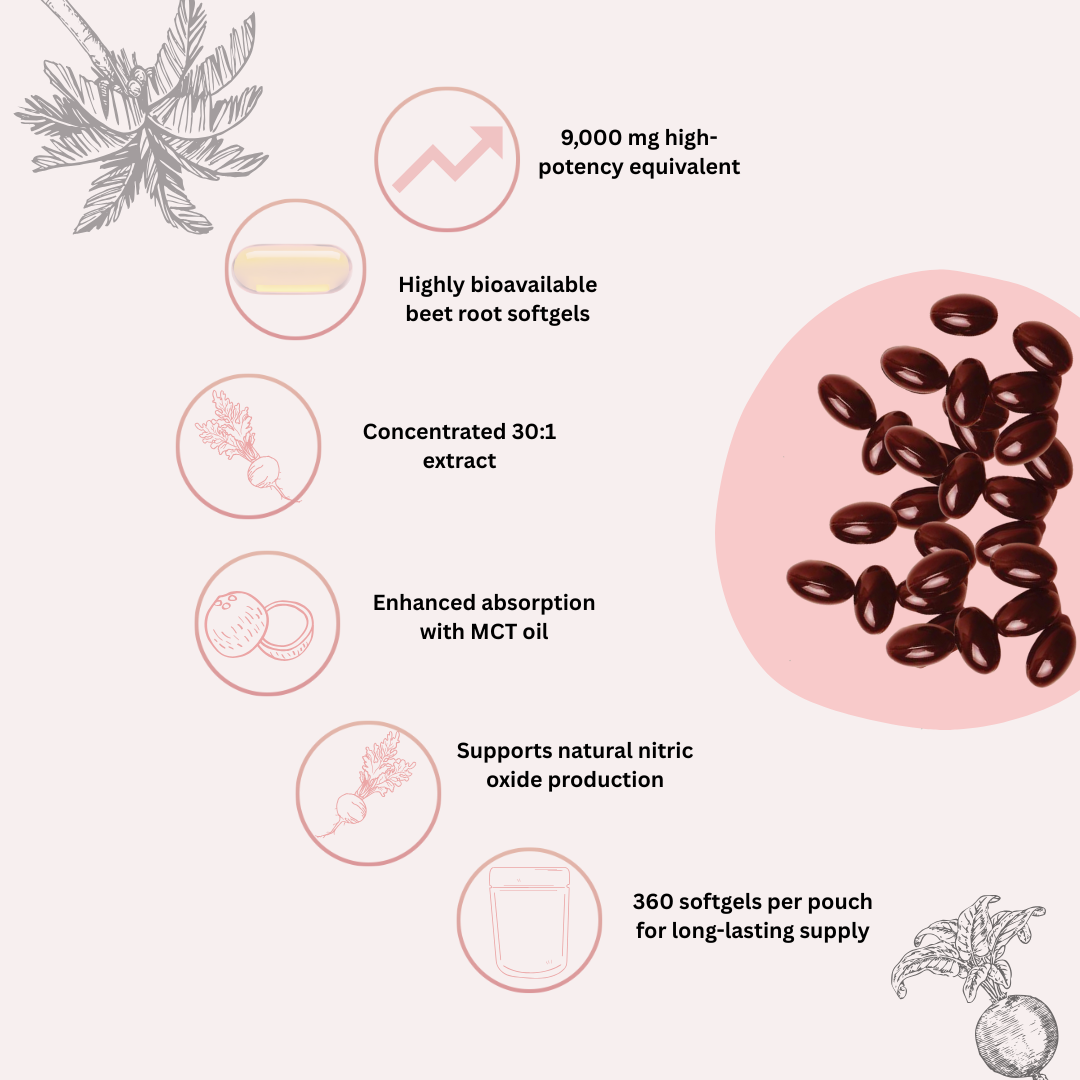 High-potency beet root support delivering a 9,000mg equivalent per serving to help support circulation, energy, and daily performance. Formulated with MCT oil from coconut for enhanced absorption, these easy-to-swallow softgels support natural nitric oxide production and healthy blood flow—without the mess or taste of powders.